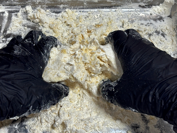 8. 반죽이 날가루 없이 한 덩이로 뭉쳐지면 덧밀가루 조금 깔아주고 반죽을 밀어 넓게 펼쳐주세요.