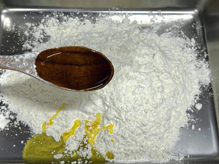 7. 면에 분량의 소금, 식용유, 물 넣어서 손반죽해 주세요.