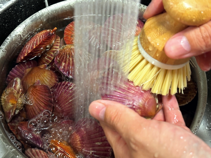 1. 먼저, 가리비를 손질할 거예요. 가리비를 찌고 난 물은 칼국수 육수로 활용할 거라, 깨끗하게 닦아줄게요. 어느 정도 강도가 있는 수세미나 솔로 껍데기를 문질러 세척을 해주세요. (가리비는 망에 걸린 채로 바닷물에 담가서 양식되기 때문에 뻘이 없어 해감을 할 필요가 없어요, 다만 짠기를 조금 빼고 싶다면 깨끗한 물에 30분 담가주세요)