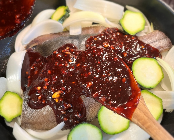 11. 가지미 위에 준비한 양념장을 부어 주세요. 팬의 가장자리 채소에도 골고루 양념장을 뿌려주세요.