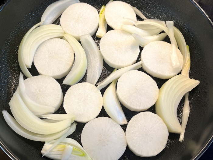 8. 이제 조림팬을 준비하시고 팬바닥에 무를 깔아주세요.