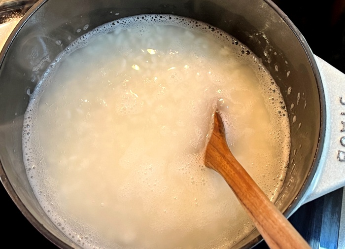 6. 이제 솥밥을 해볼게요, 솥에 불린 쌀과 동량의 준비해 둔 물을 넣어서 센 불에 끓여주세요.
