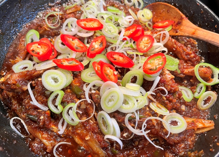 9. 대파와 홍고추는 고명용으로 예쁘게 썰어서 완성된 노가리 조림에 장식해 주세요. 완성!