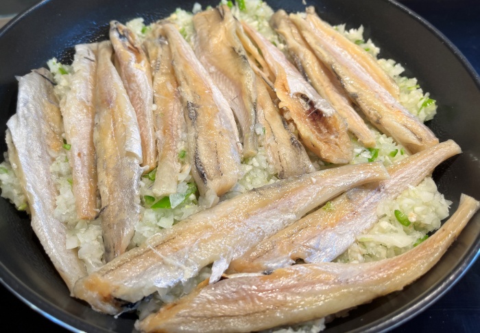6. 그리고 팬의 다진 채소 위에 손질한 노가리를 편평하게 얹어주세요.