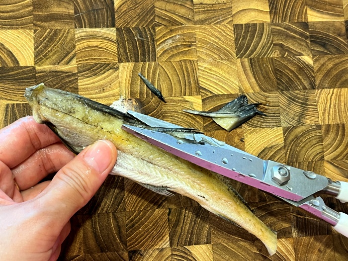 2. 물에 불려 손질이 편해진 노가리는 꼬리와 지느러미를 잘라내고 손질해 준비해 주세요.