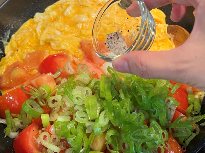 6. 풀어놓은 계란을 팬에 토마토 반대편 공간으로 부어서 스크램블해 주세요.