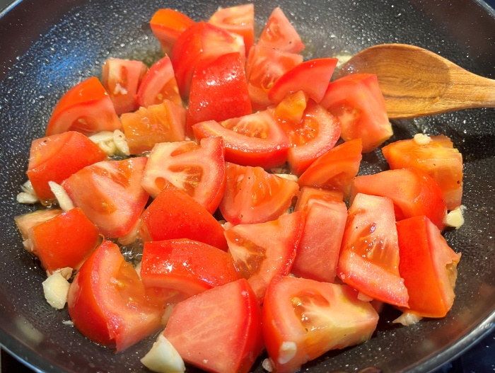 5. 마늘이 갈색으로 익기 시작하면 토마토를 넣어 마늘기름을 한번 입혀서 살짝 볶아 팬 한쪽으로 모아 놓을게요.(토마토는 가열하면 영양분의 체내흡수율을 높일 수 있어 가열하여 드시면 더 좋답니다)