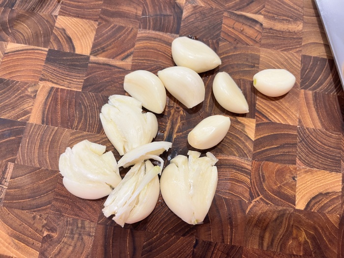 1. 통마늘은 칼 옆면으로 눌러서 으깨주시고, 파는 고명용으로 썰어주세요.(쪽파로 대체하셔도 되세요)