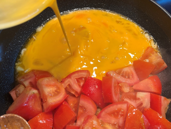 6. 풀어놓은 계란을 팬에 토마토 반대편 공간으로 부어서 스크램블해 주세요.