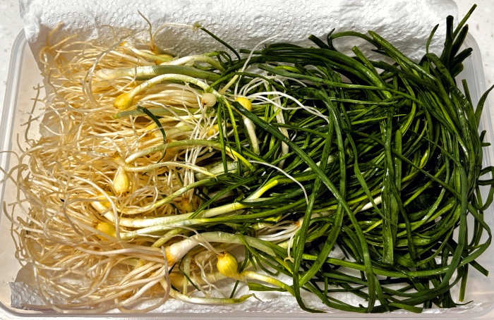 3. 양이 많아 오늘 사용하고 남길 달래는 물기를 최대한 제거한 후 밀폐용기에 키친타월을 깔고 그 위에 담은 뒤 윗면도 키친타월을 덮어 밀폐해서 냉장보관해 두시면 꽤 오래 싱싱하게 보관하실 수 있어요.(달래장에는 참기름이 들어가서 가급적이면 만들어서 바로 먹는 편이 맛이 좋아요, 바로 드실 만큼 사용하시고 남은 달래는 이렇게 보관해 두셨다가 사용하세요)