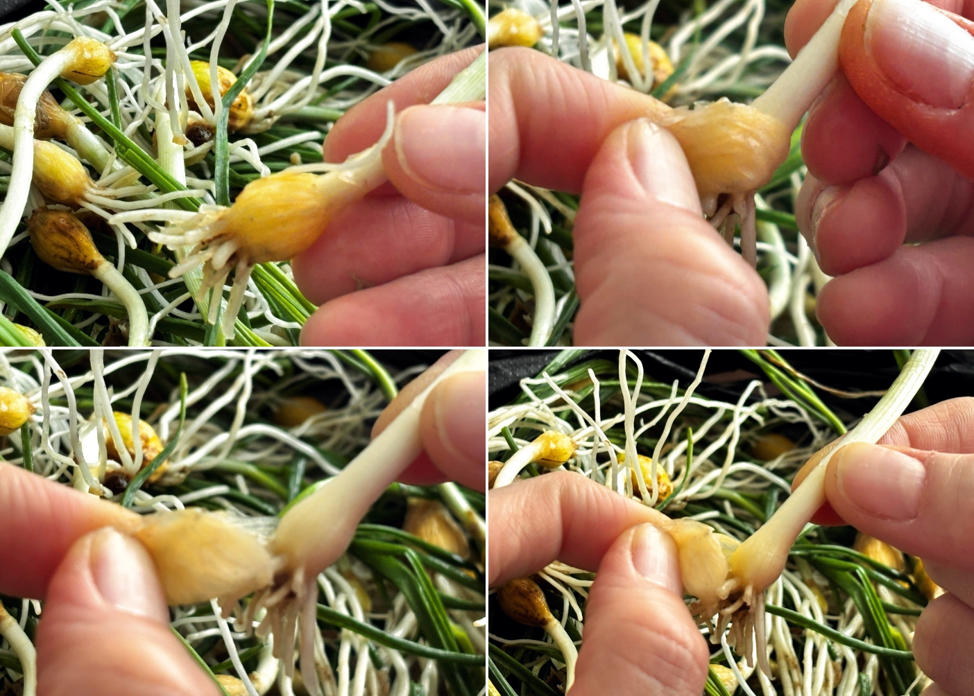 1. 달래 손질법은 간단해요, 통통하게 동그란 모양의 뿌리 부분을 살짝 비틀어 눌러주면 뿌리를 둘러싸고 있는 겉껍질이 동그란 모양대로 제거되어서 손질할 수 있으세요. 아래사진처럼요. 그리고 시든 줄기 부분을 깨끗이 골라 마무리해 내면 다듬기는 끝이랍니다. (요즘 마트에 나오는 달래는 이미 손질된 것도 많더라고요, 편리하게 손질달래 사용하셔도 되세요)