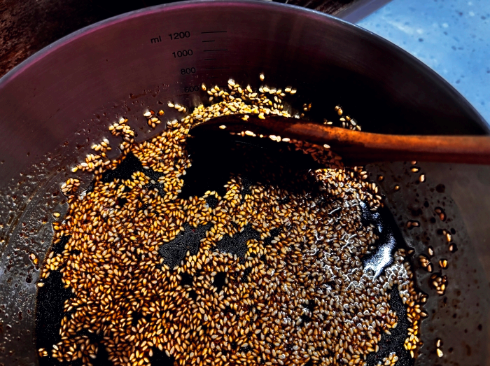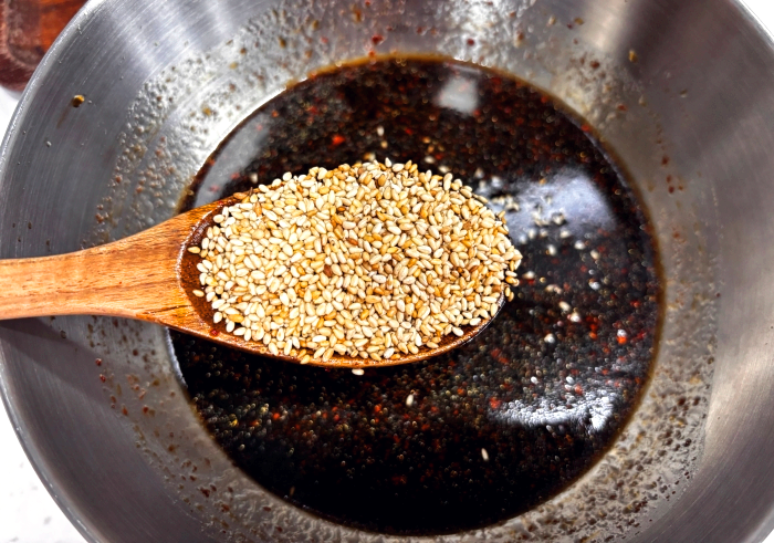 10. 그리고 준비한 통깨 듬뿍 넣어줄게요.(간에 영향을 주지 않는 참기름, 통깨는 취향에 따라 더 추가하셔도 괜찮아요)