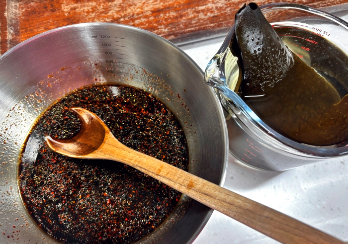 9. 그리고 준비한 분량의 다시마 육수를 넣어주세요. 이건 유셰프만의 비법인데요, 유셰프는 찬물에 우려낸 다시마육수를 조금 첨가해 주는데요, 다시마 육수를 첨가해 주면 달래장의 간이 너무 짠 것도 방지해 주고, 감칠맛이 훨씬 풍부해지는 효과가 있답니다. (이 과정은 취향에 따라 생략도 가능하세요)