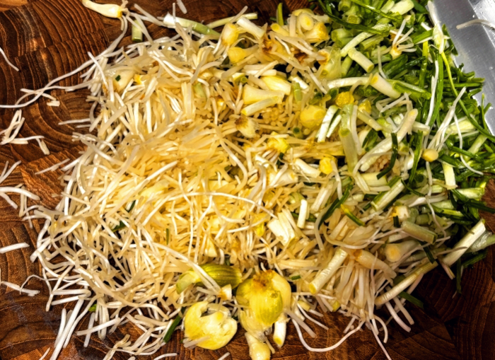 4. 달래를 썰어줄 건데요, 1cm- 2cm 이내로 썰어주시면 적당하답니다.