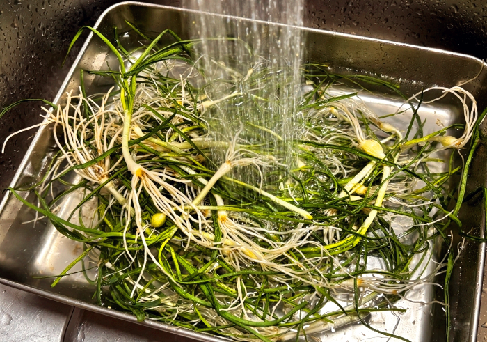 2. 잘 다듬어 준비한 달래는 2-3번 살살 물에서 흔들어 씻어 깨끗이 세척해 채반에 밭쳐 물기를 제거해 주세요.