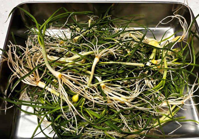 1. 달래 손질법은 간단해요, 통통하게 동그란 모양의 뿌리 부분을 살짝 비틀어 눌러주면 뿌리를 둘러싸고 있는 겉껍질이 동그란 모양대로 제거되어서 손질할 수 있으세요. 아래사진처럼요. 그리고 시든 줄기 부분을 깨끗이 골라 마무리해 내면 다듬기는 끝이랍니다. (요즘 마트에 나오는 달래는 이미 손질된 것도 많더라고요, 편리하게 손질달래 사용하셔도 되세요)