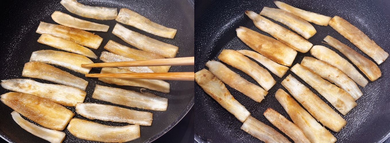 8. 유장을 발라 1차로 구워낸 더덕에 만들어 준비해 놓은 양념장을 앞뒤로 골고루 바른 후 약한 불로 타지 않게 노릇노릇 구워 통깨를 뿌려내면 완성이랍니다. (미리 더덕에 유장을 발라뒀기 때문에 구워줄 때 팬에 따로 기름은 추가하지 않아요, 또한 양념은 쉽게 탈 수 있기에 꼭 약불로 구워야 해요!)