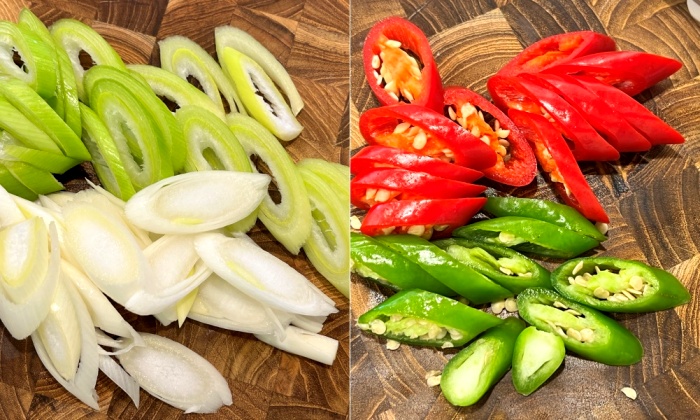 2. 준비한 채소 양파, 파, 고추를 먹기 좋은 크기로 썰어서 준비해 주세요.