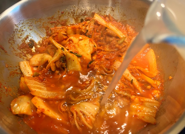 7. 김치가 어느 정도 달달 볶이면 준비한 쌀뜰물을 넣어 끓여주세요.(쌀뜰물이 없으시면 코인 육수 사용하셔도 되고, 그냥 물로도 가능해요)