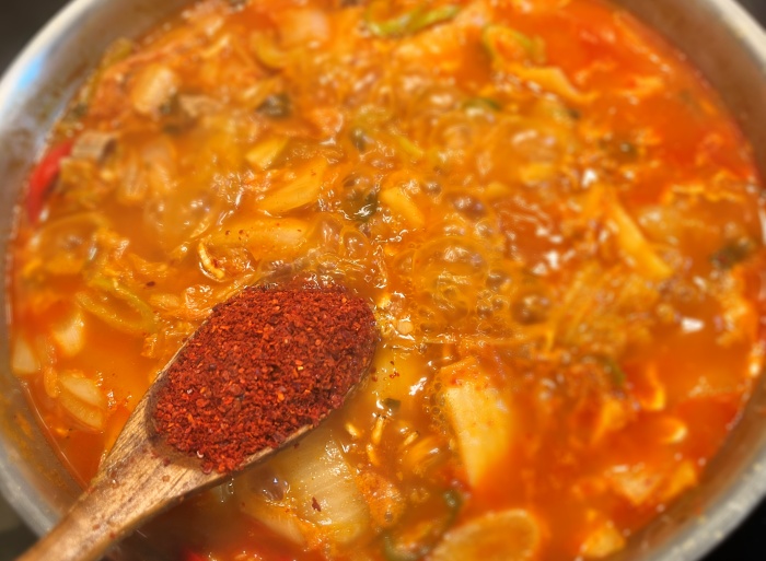 ※ 기본의 양념 분량을 모두 사용하시고 만약 간이 싱겁더라도, 채소가 다 익을 정도로 한번 다 끓인 후 간을 추가하세요. 김치찌개는 오래 끓여 맛을 내면서 나중엔 간이 진해지기에 어느 정도 끓여 완성된 간을 생각하셔야 해요!