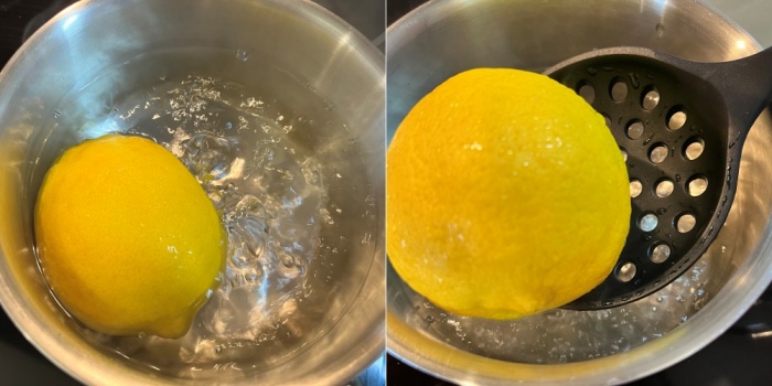 레몬은 끓는 물에 오래 두지 마시고 10초 이내로 물안에서 굴려 골고루 데쳐내주세요. 데쳐낸 레몬은 차가운 물에 한번 헹궈주세요.