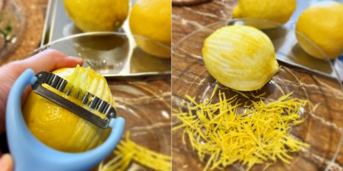 세척 과정이 모두 완료된 레몬은 필러나 채칼을 사용해서 껍질을 벗겨내주세요. (흰 부분이 너무 깊게 들어가면 쓴맛이 강해질 수 있어요, 적당히 벗겨내주세요)
