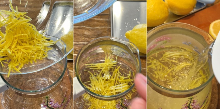 4. 벗겨낸 레몬의 껍질에 1L의 마시는 물을 끓여서 부어줍니다. 그리고 식혀서 하룻밤을 냉장고에 둘 거예요.(1-2 시간만에도 많이 우러나오지만 유셰프는 하룻밤을 우려내는 것을 추천합니다)