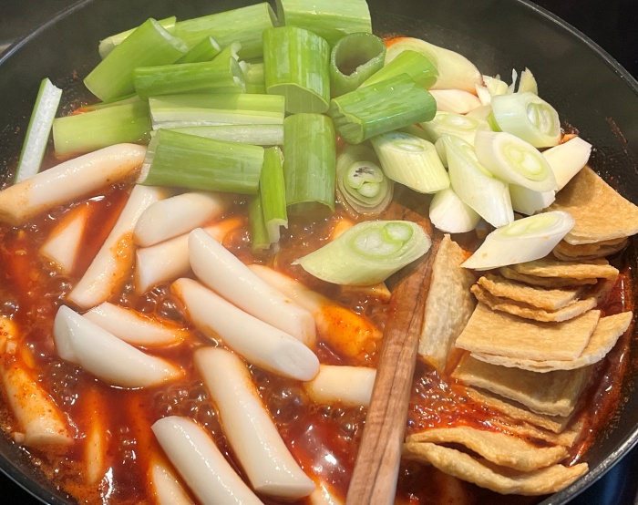 5. 양념장이 끓어오르면 떡과 어묵, 파를 넣어주세요.