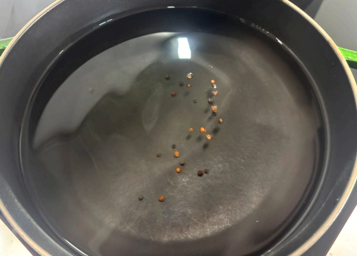 4. 냄비에 고기가 충분히 잠길만큼의 물을 넣고 준비한 통후추와 월계수잎을 넣어 불에 올려주세요.