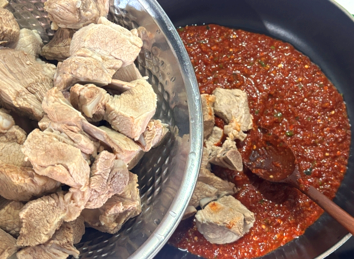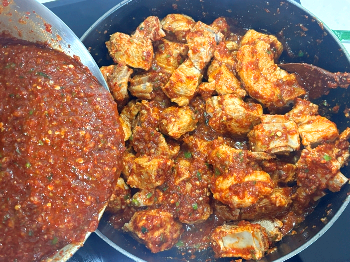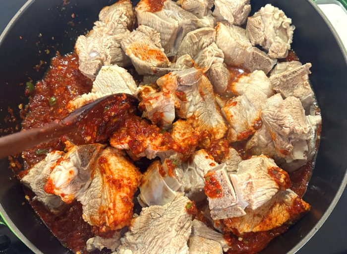 11. 본격적으로 졸이기 전에, 삶은 돼지갈비를 냄비 안 양념에 넣어 간단히 버무려 양념을 한 겹 발라줄게요.