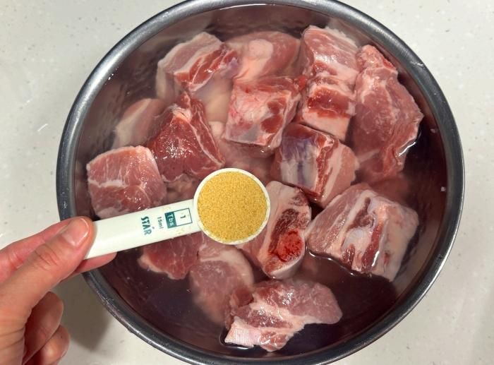 2. 돼지갈비를 찬물에 담가 핏기를 뺄 때 설탕 한 큰 술 넣어주시면 시간을 단축할 수 있어요. 참고하세요.