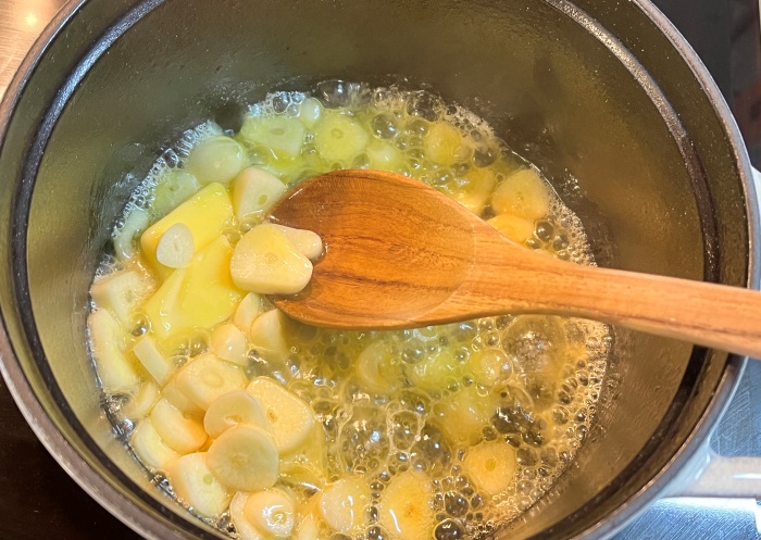 녹은 버터에 마늘을 볶아주세요. 버터에 마늘 볶는 향이 정말 좋아요!