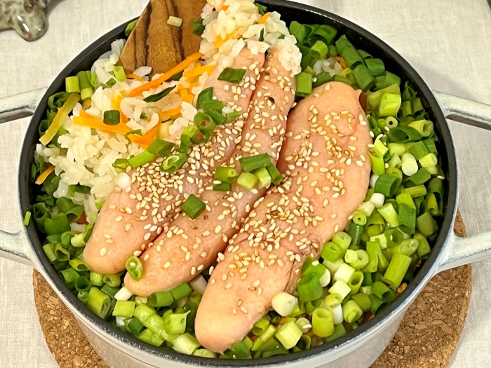 밥이 다 되면, 썰어놓은 쪽파를 밥 위에 먼저 깔고, 그 위에 명란을 얹어주세요. 그리고 명란 위에 남겨둔 버터 10g을 얹어 재빨리 다시 뚜껑을 덮어주세요. 그리고 10-15분 뜸을 들여주세요.