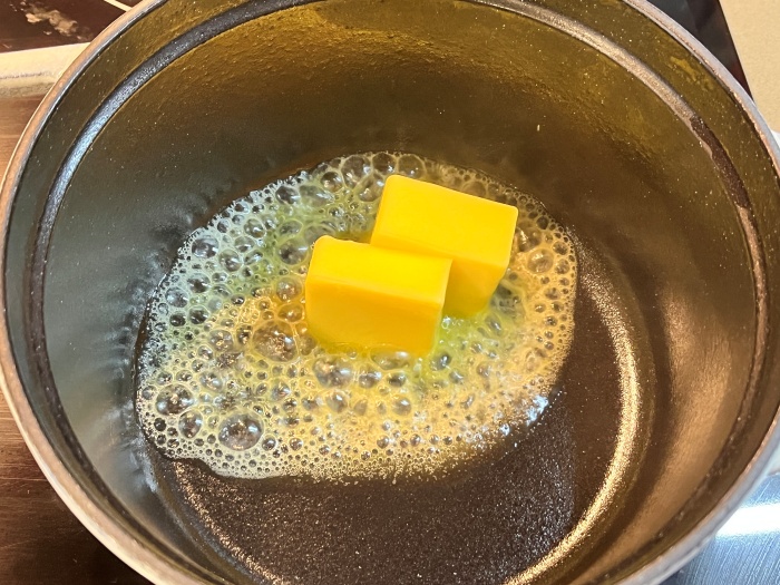 솥을 예열해 주시고 버터를 40g 넣어 녹여주세요.(나머지 10g의 버터는 나중에 명란에 사용할거예요)