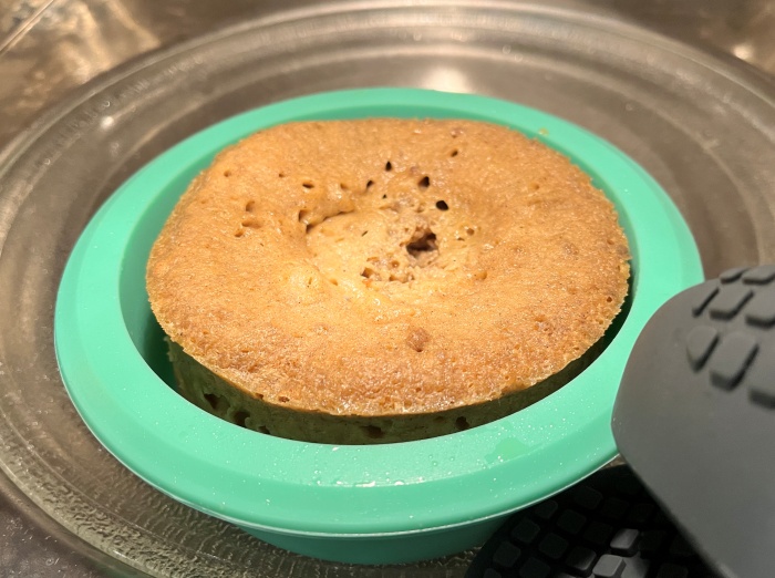 7. 다 조리된 빵을 케익테스터로 바닥까지 찔러보아 묻어 나오는 게 없다면 조리가 완료된 거예요. (반죽이 묻어 나온다면 전자레인지 조리 시간을 조금 더 연장하세요.