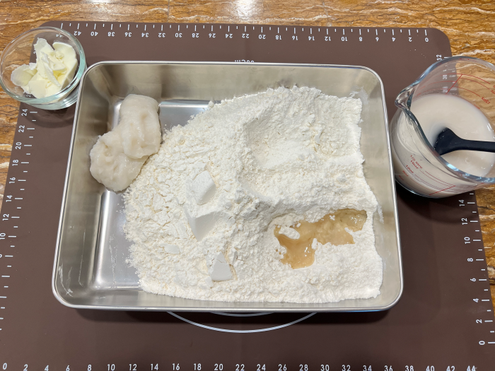 1. 준비한 반죽재료를 모두 반죽 그릇에 넣고 반죽할게요. 소금과 설탕, 이스트는 꼭 직접적으로 닿지 않게 넣어주세요.