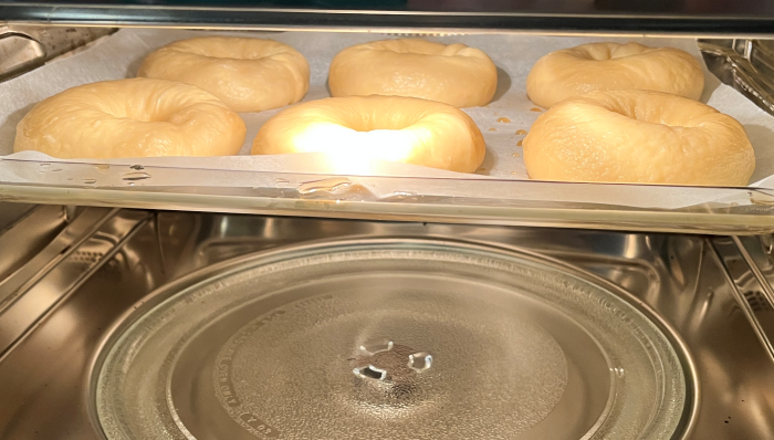 14. 데쳐서 건져낸 베이글은 미리 예열해 놓은 오븐으로 바로 넣어 구워줄게요. 컨백션 오븐은 섭씨 220도 15분, 데크 오븐은 윗불 섭씨 220도 아랫불 섭씨 200도로 15분 구워주세요. 베이글이 구워지는 향기가 너무 좋아요!