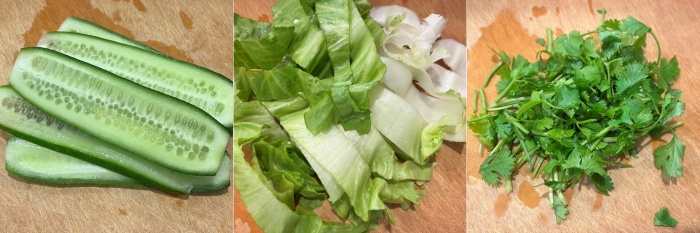 1. 준비한 오이와 잎채소, 고수를 세척해서 적당하게 원하는 대로 썰어서 준비해주세요. (고수에 생각보다 흙이 많을거예요)