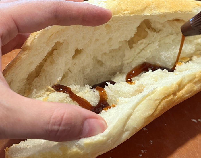 5. 이제 준비한 재료들로 베트남식 바게트 속을 채워줄건대요, 먼저 원하는 소스를 발라주세요. 유셰프는 칠리소스와 바베큐소스, 그리고 마요네즈를 사용했어요.
