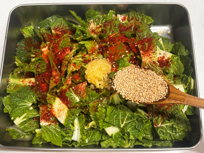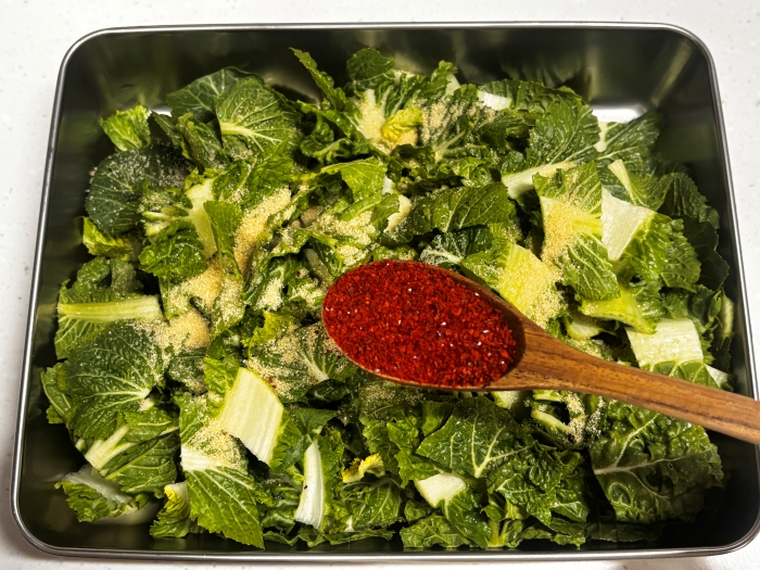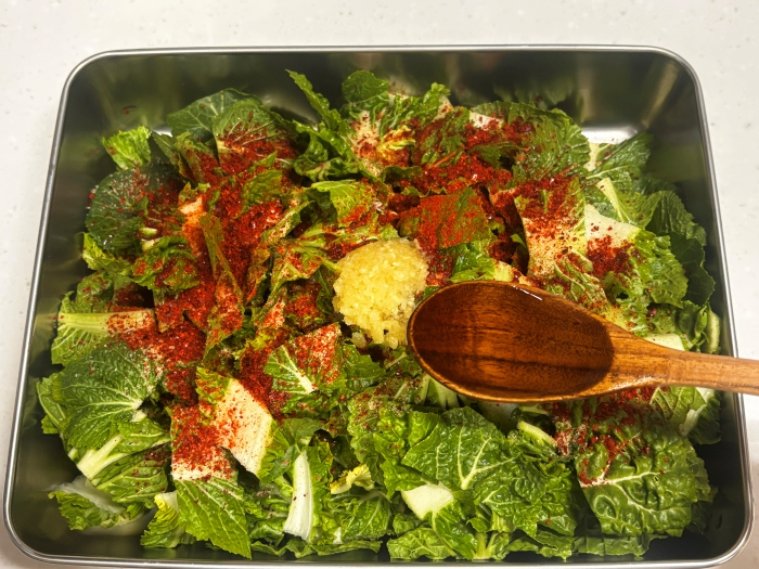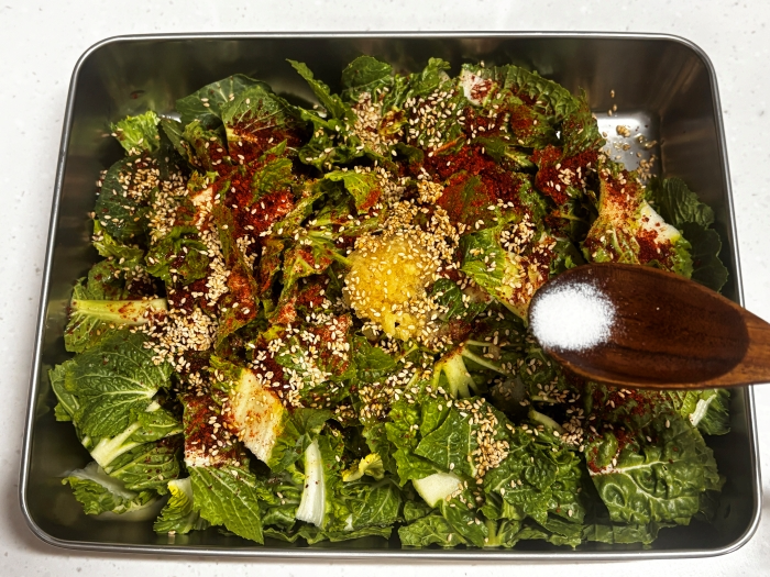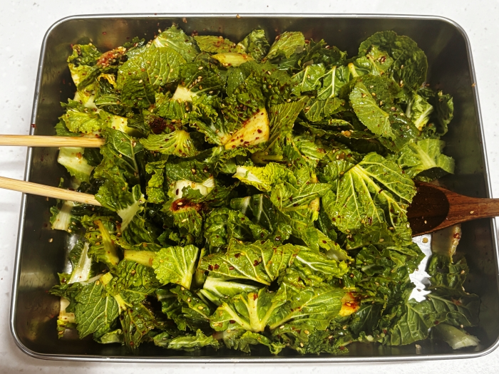 13. 봄동이 너무 숨 죽지 않도록 손보다는 도구로 슬쩍만 대충 버무려주어도 충분해요.