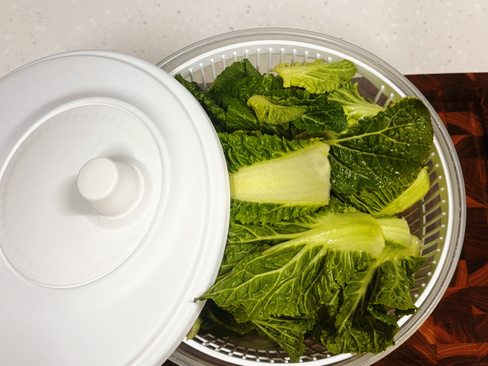 3. 탈수기를 사용하여 세척 후 봄동에 남은 물을 가능한 남김없이 빼주었어요.