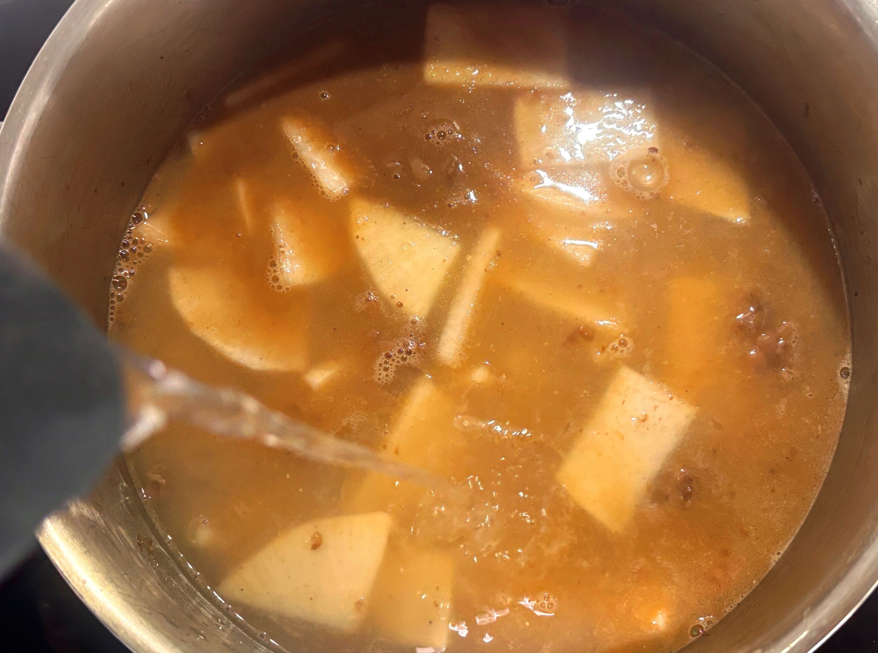 7. 고기가 반정도 익으면 무를 넣어 고기의 육즙과 간이 섞이도록 살짝만 함께 볶아줄게요. ( 무를 익히려는 것은 아니에요)