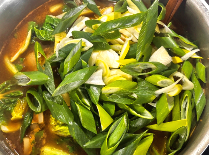 12. 손질해서 준비해 둔 봄동과 파도 넣어주세요.