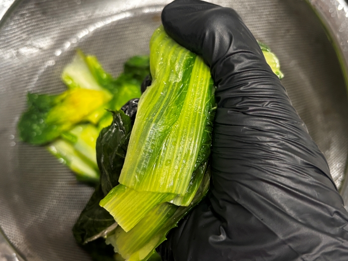 6. 채반에 물을 뺀 봄동배추를 한번 더 손으로 물기를 꽉 짜서 제거해 주세요.