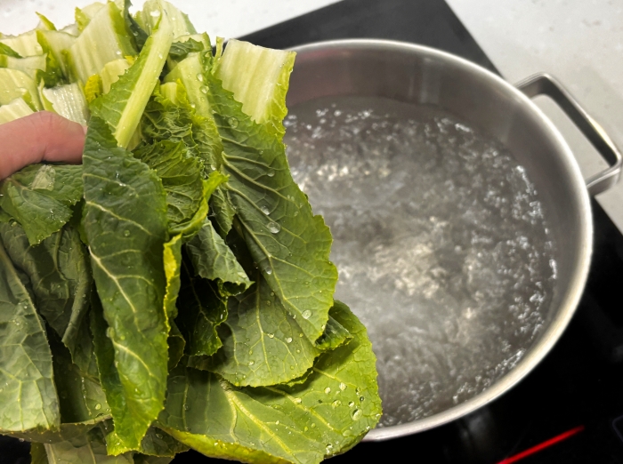 4. 물이 끓어오르면 손질한 봄동배추의 흰 부분부터 넣어 2분 이내로 봄동배추의 흰 부분이 유연하게 구부려질 때 건져내 주세요.(이파리 녹색 부분은 거의 넣자마자 데쳐진답니다)