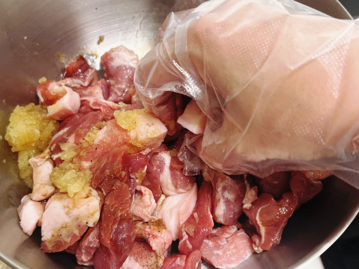 3. 돼지고기는 볶기 전 분량의 다진 마늘, 맛술, 국간장, 후추를 넣어 조물조물 버무려 밑간해 준비해 주세요.