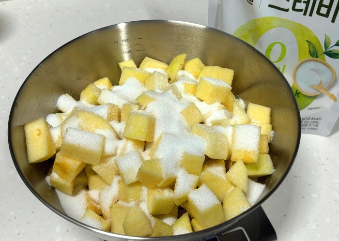 3. 자른 사과는 30분 정도 설탕에 절여 준비해 주세요. 사과에 수분이 빠져나와서 넣는 물의 양을 줄일 수 있어요)