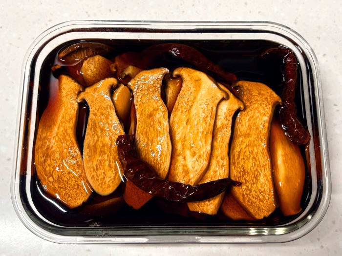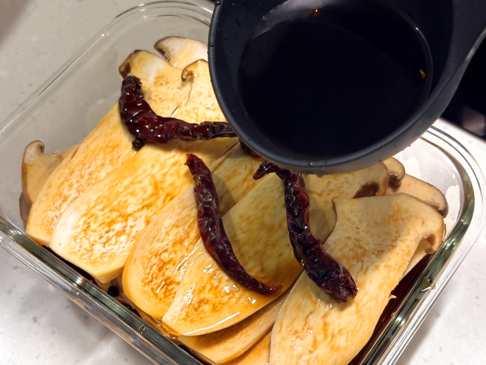 새송이버섯은 보통 구워 먹으면 식감이 좋아 고기처럼 맛있지만 장아찌로 담그면 더 쫄깃한 식감이 새콤달콤한 간과 함께 어울려 이색적인 맛을 즐길 수 있답니다.