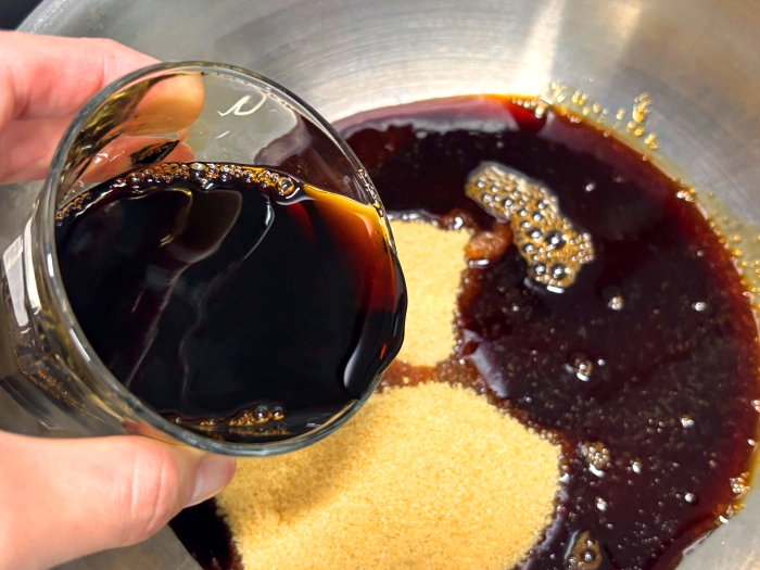 4. 이제 장아찌 절임물을 만들어 줄게요, 준비한 분량의 설탕, 간장, 식초, 물을 냄비에 모두 넣고 끓여줄게요.