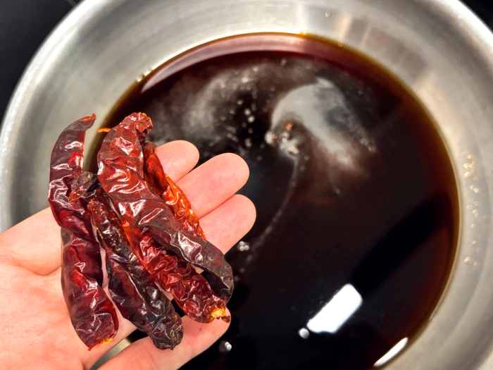 5. 준비한 건고추와 통후추를 장아찌 절임물에 넣어 절임물을 끓여주세요. 장아찌 절임물이 끓어오르고 5분 정도 더 끓여준 후 불에서 내려주세요.